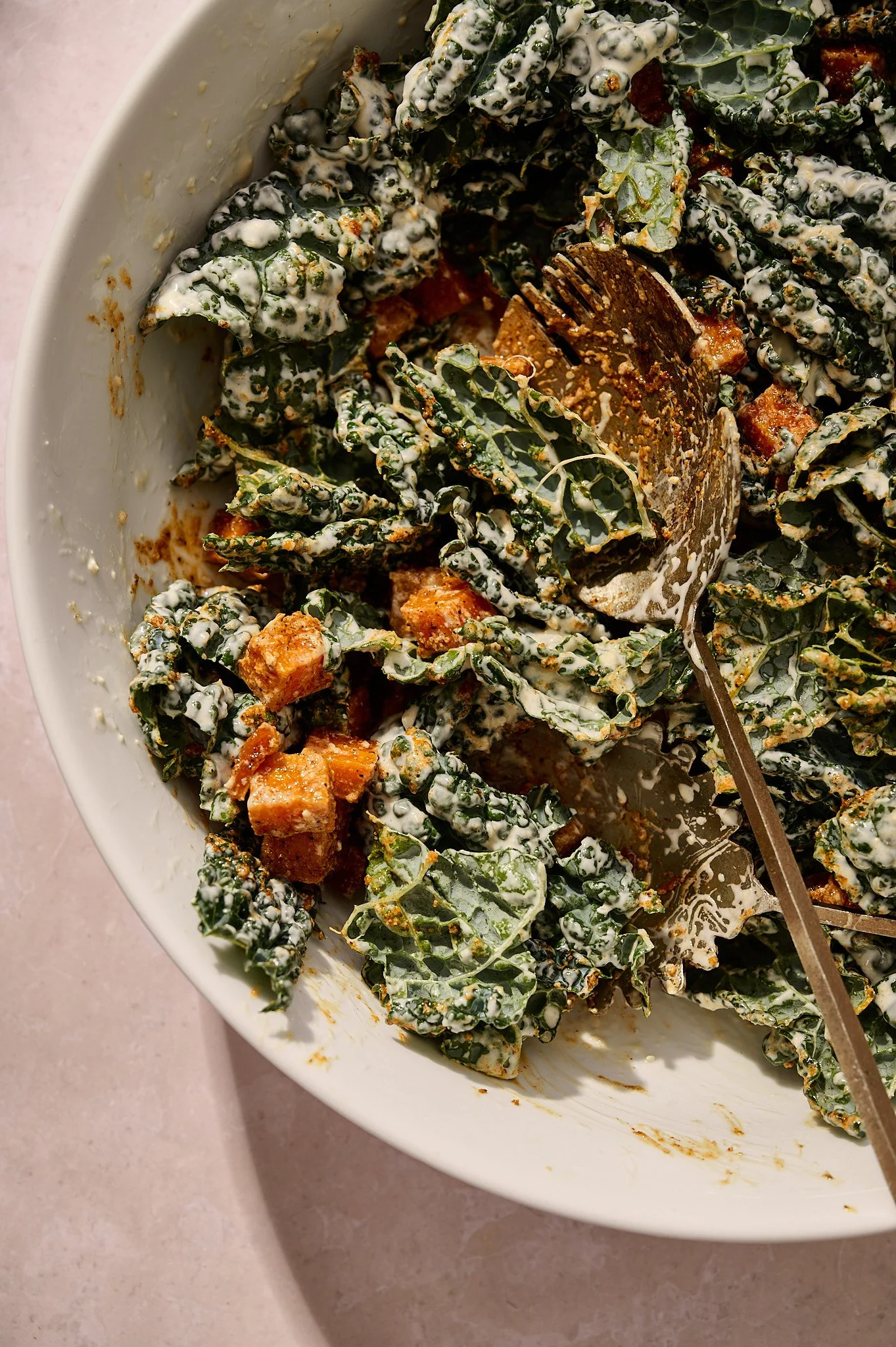 Toss the roasted squash into the kale.